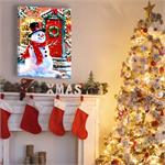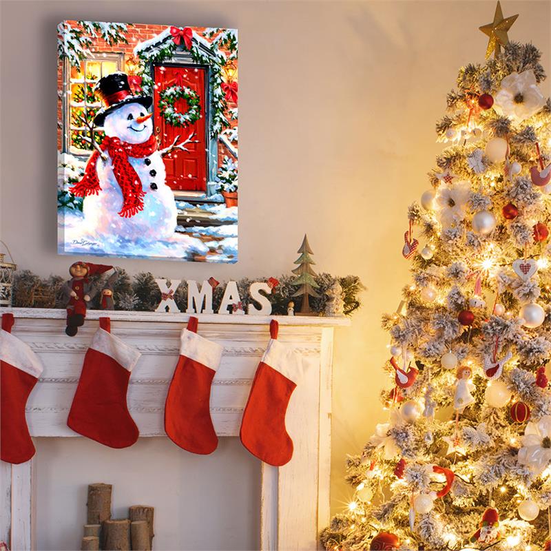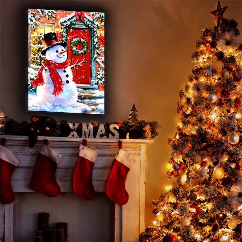 Illuminated wall art by Dona Gelsinger. Features a festive Snowman, complete with tartan plaid scarf, black top hat, and buttons made out of coal. Blue traditional farmhouse with Christmas lights sits in the background.