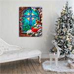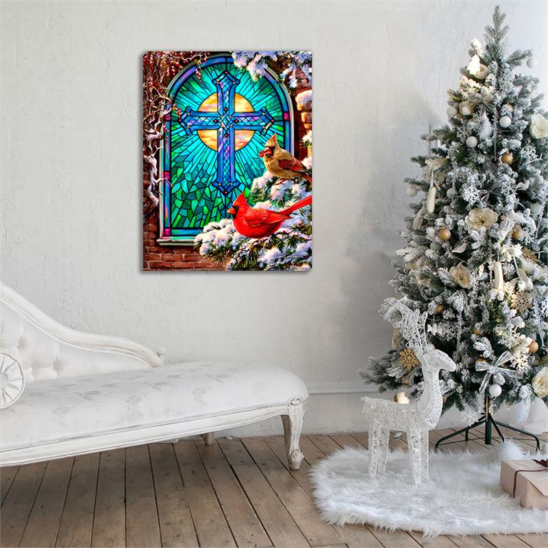 Bright cardinal birds sit on a evergreen bough covered in snow. Stained glass cross sets behind them in blues, greens, and teals.