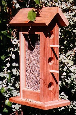 Constructed of Cedar and 1/8" wire mesh, this feeder is perfect for finch and thistle seeds. It can be hung from a tree or hook. This feeder is easy to fill and clean and has six feeding ports.