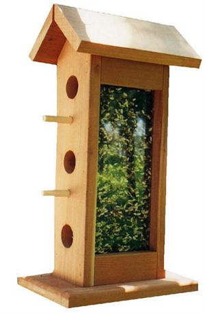 Constructed of Cedar and plexiglass this feeder can be hung from a tree or hook. This feeder is easy to fill and clean and has six feeding ports.