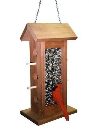 Constructed of Cedar and 1/4" wire mesh, this feeder is perfect for sunflower seeds. It can be hung from a tree or hook. This feeder is easy to fill and clean and has six feeding ports.