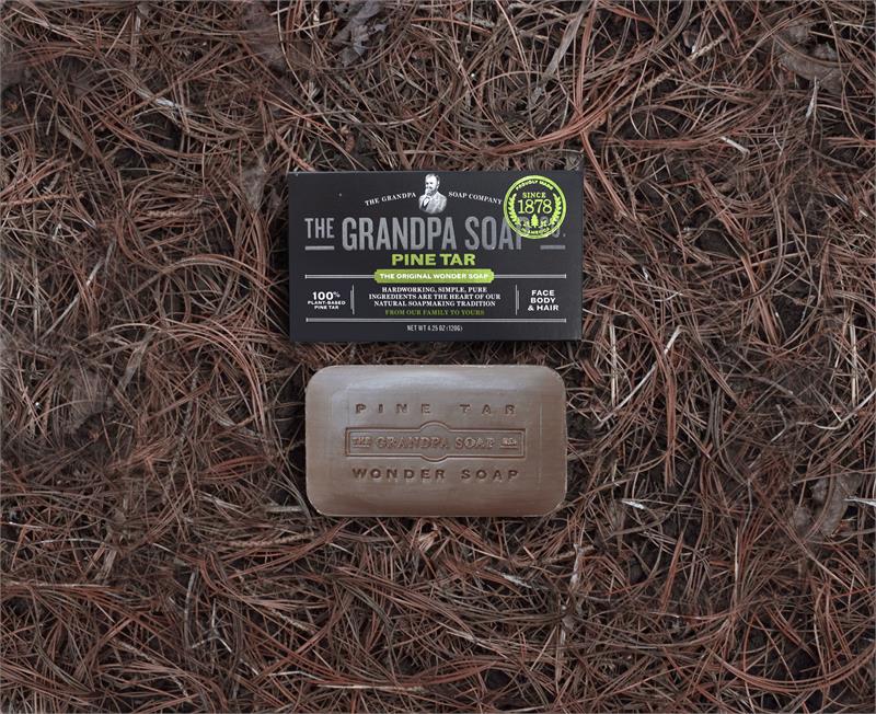 Grandpa's Soap Company Original Wonder Pine Tar SoapWe offer Grandpa's Pine Tar Soap in two different bar sizes: medium bar and large bath bar. Please use the pull-down menu to make your selection. Grandpa's Pine Tar bar soap is the original wonder soap. Ideal for showering, shampooing and facial grooming, this 3-in-1 wonder soap is made with natural pine tar oil to deeply cleanse, deodorize and moisturize from head to toe. For many years, folks have found that pine tar soap is beneficial in treating the scales of Psoriasis, Dandruff, Eczema, and other skin irritations. And don't worry, Grandpa's Pine Tar soap lathers white! Grandpa’s “Wonder” Pine Tar Soap has been manufactured and sold continuously since 1878. Ingredients in Grandpa's Wonder Pine Tar Soap Bar:Sodium Palmate, Sodium Cocoate / Sodium Palm Kernelate, Water (Aqua), Glycerin, Pinus Palustris Wood Tar, Sodium Chloride, Sodium Gluconate No Phthalates, Sulfates, Parabens, EDTA, Glutens, Animal By-Products, Artificial Fragrances or ColorantsIngredients in Grandpa's Pine Tar are certified Gluten Free by the Celiac Support Foundation, FSC Certified Environmentally Friendly, Sodium Palmate made with palm oil from Rainforest Alliance CertifiedTM farms, Certified Cruelty Free, and comes packaged in recyclable packaging. This item proudly made in the U.S.A.
