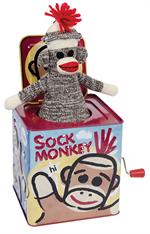 Sock Monkey Jack-In-The-Box is a great addition to every child's toy chest. It is sure to bring a smile to every child's face. The tin box is a little over 5" tall and has a plush puppet. It plays "Pop Goes the Weasel". This box is safe for 18 months +.