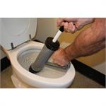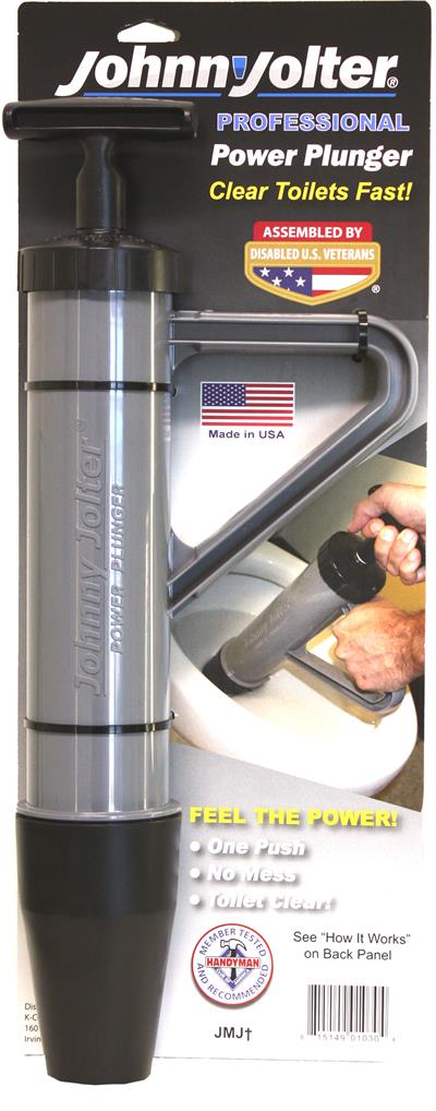 Johnny Jolter Professional Power Plunger #JJR-304Standard toilet plungers generate little pressure but can create quite a mess. The Johnny Jolter Power Plunger uses the power of water pressure to clear even the most stubborn clogs within seconds and without making a mess. It fits snugly into all residential and commercial toilets of any type or size. Simply retract the power plunger handle drawing water into the unit. Pushing the handle down creates a powerful clog busting force that immediately dislodges most clogs. The unit is 20 1/2” long and has been ergonomically designed for comfortable use. Easily disassembles for quick cleaning after use. Made in the USA by disabled U.S. Veterans. HOW JOHNNY JOLTER PROFESSIONAL PLUNGER WORKS:
