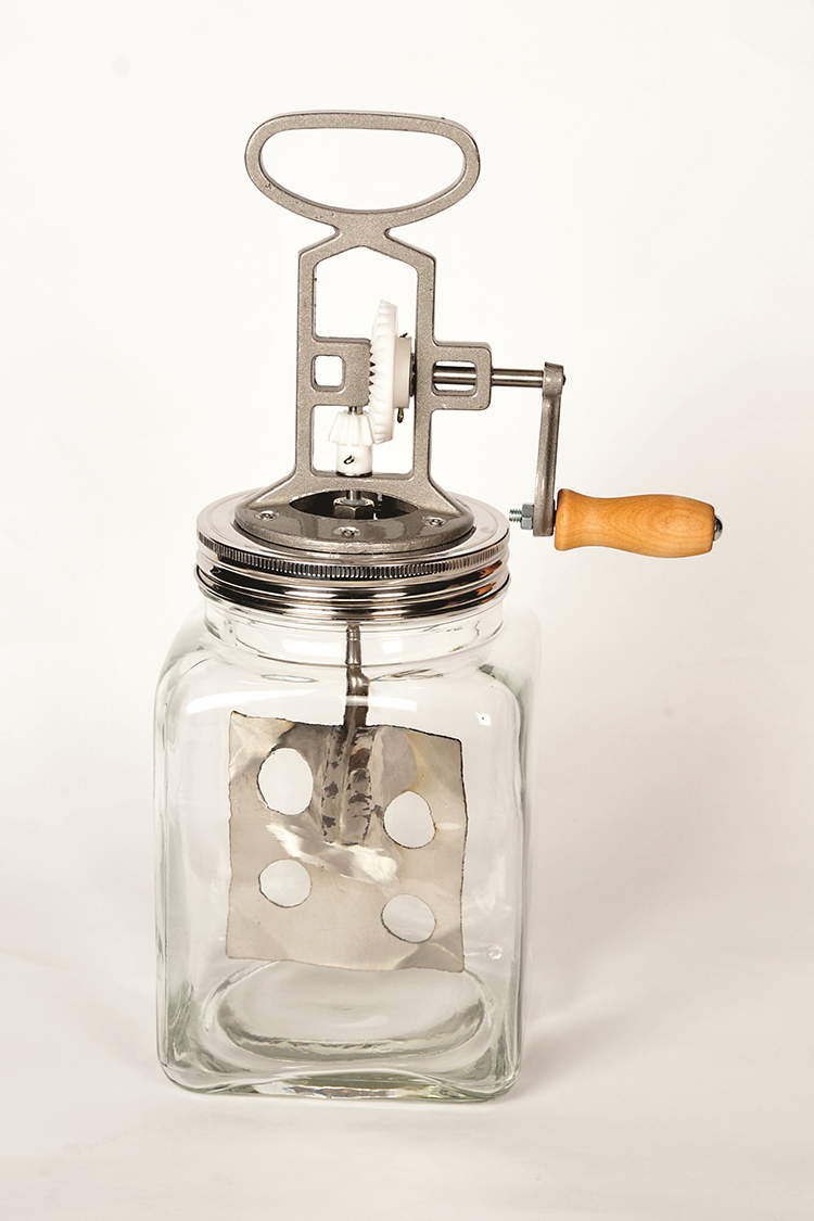 Features of the Large Hand Crank Butter Churn: --Churns up to 2.5 qts of cream (80 ounces), twice as much as competing models Improved paddle design shortens cream to butter cycle by 20% -Make homemade butter in as little as 15 minutes! -Wide 5" opening makes butter removal faster and easier -Total capacity is 4 quarts -Assembled in USA (domestic and imported parts) -Includes FREE Making Cheese, Butter and Yogurt booklet with tips and recipes
