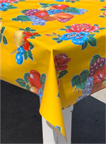 Lemons on Yellow Oil Cloth, Full Bolt of 12 Yards. Oilcloth yardage featuring bright lemons and delicious assorted fruit baskets... large alluring roses too! A vintage-inspired design that leaves you with a feeling of comforting nostalgia.