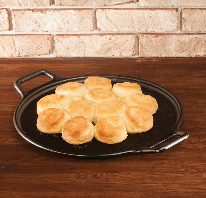 This round cast iron griddle pan is the perfect tool for cooking pancakes, pizza or quesadillas. The slightly raised edges keep oil, batter and other ingredients neatly contained. Cast iron can be used on a stovetop, in an oven or over a campfire.