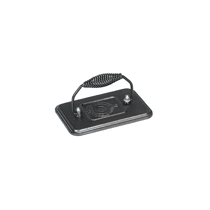 Lodge Cast Iron 6.75" x 4.5" Rectangular Bacon Press #LGP3 Pre-Seasoned American Made Cast Iron CookwareOn the stove top or grill, the Lodge rectangular grill press is perfect for eliminating curl from bacon or ham, pressing unwanted fats from your burgers or sausages, and holding heat in your grilled sandwiches. The heavy-duty cast iron base has a unique hammered finish and features a safe cool-grip spiral handle. About Lodge Manufacturing, the largest USA based Cast Iron Cookware maker:
