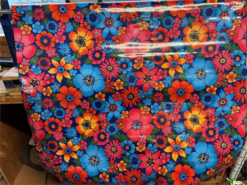 London on Light Blue Oil Cloth. Sold by the Yard. Oilcloth yardage that brings to mind the Swingin' 70's in London. Groovy, baby! Great big flowers popping and bright colors inspired by Carnaby Street. Keep the good vibes alive with this vibrant print.
