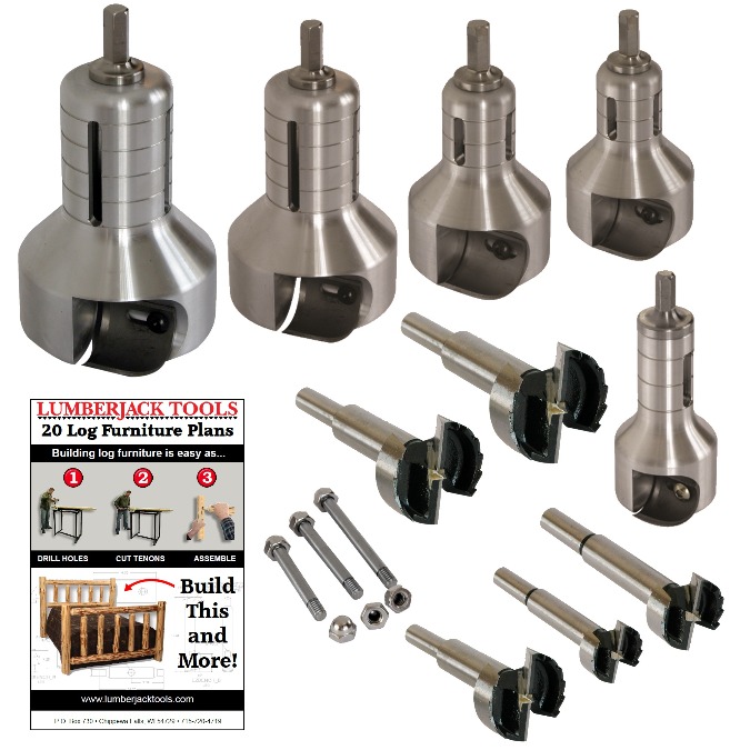 Our 5 piece Professional Kit enables you to build your own log furniture, achieving old world craftsmanship with todays most advanced log cutting technology! Lumberjack tools will help achieve precise results while saving time and money. Dual blade tenon cutters deliver the highest level of performance and technology. U.S.A. Cutter Size (in.): 1/2, 3/4, 1, 1 1/2 and 2,Compatible Tool: 1/2 in. Drill, Forstener Bit Size (in.): 1/2, 3/4, 1,1 1/2 and 2. Radius Shoulder.