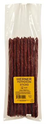 Fresh and tasty Pepperoni Beef Sticks made by Werner Jerky of Tillamook, Oregon. 12" length Pepperoni sticks, 20 count package.