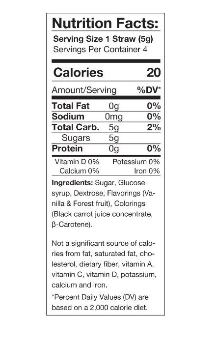 Ingredients: Sugar, glucose syrup, dextrose, flavoring (vanilla, forest fruit), coloring: black carrot juice concentrate, carotene