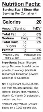 Ingredients: Sugar, glucose syrup, dextrose, Cinnamon Powder flavoring (vanilla), coloring: carotene