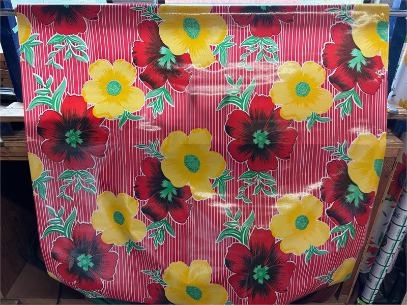 Mali on Red Oil Cloth, Full BoltOilcloth has been around for over a century and when it comes to making a bold color statement anywhere in your home. Oilcloth is a long-lasting, sturdy product that comes in vibrant colors. The oilcloth of yesteryear was resin-coated vinyl and the finish sometimes cracked or flaked. The new version is made of hi-tech plastic that won't crack but has the same colorful shine. Oilcloth has a mesh backing, which means it can really hold a stitch. It can be used for anything that needs to be durable and colorful--tablecloths, upholstered dining room chairs, curtains, bibs, lampshades, tissue boxes, outdoor chairs, etc. Your only limited by your imagination! Oil Cloth measures 48" wide & a full bolt equals 12 continuous yards (36 feet) Don't see the pattern or color you want? Please let us know and we will order it for you!