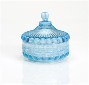 Mosser Glass Aqua Opal Eye Winker Candy Dish with Lid #409CCAOMosser's Eye Winker pattern comes from the Victorian Era of fancy patterned glassware, and is popular today as well. The Eye Winker gets is name due to the oval or eye shaped design in the lower portion of the glassware. The upper portion of the Eye Winker design features vertical ribs. The Eye Winker covered Candy Dish measures 5.5" deep x 6" high and comes with coordinating lid with fancy knob. Any type of candy looks prettier when stored in our Eye Winker candy dish. Mosser's Aqua and Opal glass is a translucent light blue glass that finishes off into a opalescent Opal or Milk glass color. A stunning combination. The craftsmen at Mosser Glass have been producing quality American Made Glassware since the 1950s. Mosser Glass produces high quality glassware made with fine craftsmanship. Each piece of Mosser Glass is hand blown and hand finished. Many pieces are made to order. Please allow 1-2 weeks for delivery. Proudly Made in the U.S.A.