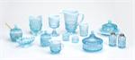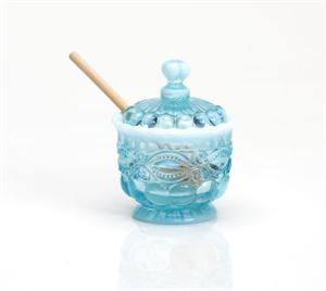Mosser Glass Aqua Opal Eye Winker Honey Jar with Lid #409HAOMosser's Eye Winker pattern comes from the Victorian Era of fancy patterned glassware, and is popular today as well. The Eye Winker gets is name due to the oval or eye shaped design in the lower portion of the glassware. The upper portion of the Eye Winker design features vertical ribs. Mosser's Eye Winker Honey Jar comes complete with a fancy matching lid with knob. The Honey Jar measures 4" deep x 5" high. A cute addition to any Eye Winker table setting. Mosser's Aqua and Opal glass is a translucent light blue glass that finishes off into a opalescent Opal or Milk glass color. A stunning combination. The craftsmen at Mosser Glass have been producing quality American Made Glassware since the 1950s. Mosser Glass produces high quality glassware made with fine craftsmanship. Each piece of Mosser Glass is hand blown and hand finished. Many pieces are made to order. Please allow 1-2 weeks for delivery. Proudly Made in the U.S.A.