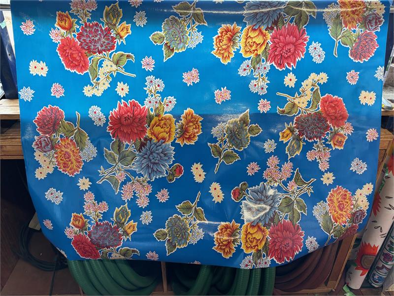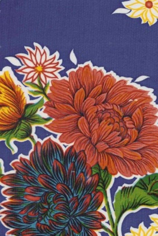 Mums on Blue Oil Cloth, Full BoltOilcloth has been around for over a century and when it comes to making a bold color statement anywhere in your home. Oilcloth is a long-lasting, sturdy product that comes in vibrant colors. The oilcloth of yesteryear was resin-coated vinyl and the finish sometimes cracked or flaked. The new version is made of hi-tech plastic that won't crack but has the same colorful shine. Oilcloth has a mesh backing, which means it can really hold a stitch. It can be used for anything that needs to be durable and colorful--tablecloths, upholstered dining room chairs, curtains, bibs, lampshades, tissue boxes, outdoor chairs, etc. Your only limited by your imagination! Oil Cloth measures 48" wide & a full bolt equals 12 continuous yards (36 feet) Don't see the pattern or color you want? Please let us know and we will order it for you!