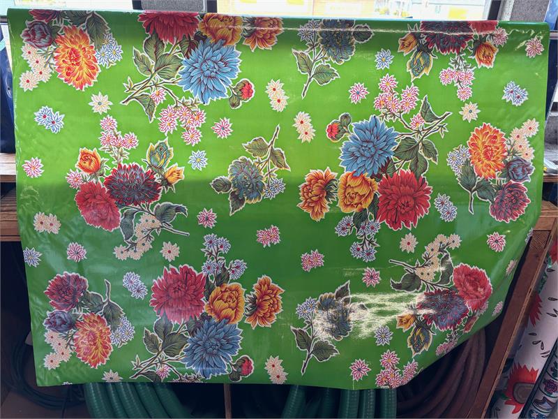 Mums on Green Oil Cloth, YardageOilcloth has been around for over a century and when it comes to making a bold color statement anywhere in your home. Oilcloth is a long-lasting, sturdy product that comes in vibrant colors. The oilcloth of yesteryear was resin-coated vinyl and the finish sometimes cracked or flaked. The new version is made of hi-tech plastic that won't crack but has the same colorful shine. Oilcloth has a mesh backing, which means it can really hold a stitch. It can be used for anything that needs to be durable and colorful--tablecloths, upholstered dining room chairs, curtains, bibs, lampshades, tissue boxes, outdoor chairs, etc. Your only limited by your imagination! Oil Cloth measures 48" wide & a full bolt equals 12 continuous yards (36 feet) Don't see the pattern or color you want? Please let us know and we will order it for you!