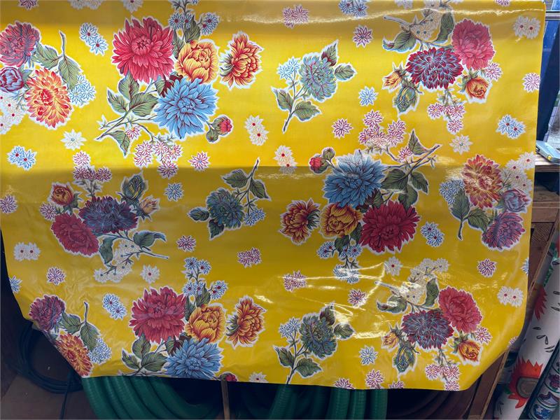Mums on Yellow Oil Cloth, Full BoltOilcloth has been around for over a century and when it comes to making a bold color statement anywhere in your home. Oilcloth is a long-lasting, sturdy product that comes in vibrant colors. The oilcloth of yesteryear was resin-coated vinyl and the finish sometimes cracked or flaked. The new version is made of hi-tech plastic that won't crack but has the same colorful shine. Oilcloth has a mesh backing, which means it can really hold a stitch. It can be used for anything that needs to be durable and colorful--tablecloths, upholstered dining room chairs, curtains, bibs, lampshades, tissue boxes, outdoor chairs, etc. Your only limited by your imagination! Oil Cloth measures 48" wide & a full bolt equals 12 continuous yards (36 feet) Don't see the pattern or color you want? Please let us know and we will order it for you!