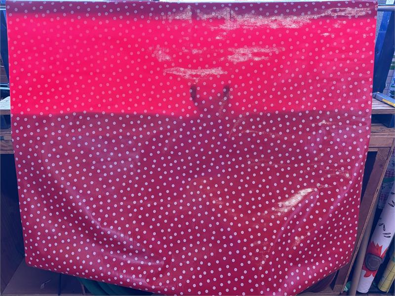 Polka Dots White on Red Oil Cloth , yardageOilcloth has been around for over a century and when it comes to making a bold color statement anywhere in your home. Oilcloth is a long-lasting, sturdy product that comes in vibrant colors. The oilcloth of yesteryear was resin-coated vinyl and the finish sometimes cracked or flaked. The new version is made of hi-tech plastic that won't crack but has the same colorful shine. Oilcloth has a mesh backing, which means it can really hold a stitch. It can be used for anything that needs to be durable and colorful--tablecloths, upholstered dining room chairs, curtains, bibs, lampshades, tissue boxes, outdoor chairs, etc. Your only limited by your imagination! Oil Cloth measures 48" wide & a full bolt equals 12 continuous yards (36 feet) Don't see the pattern or color you want? Please let us know and we will order it for you!Download a sewing pattern with complete instructions that you can print out at home to make an adorable bib with these oil cloth materials courtesy of Oilcloth.com. Click Here