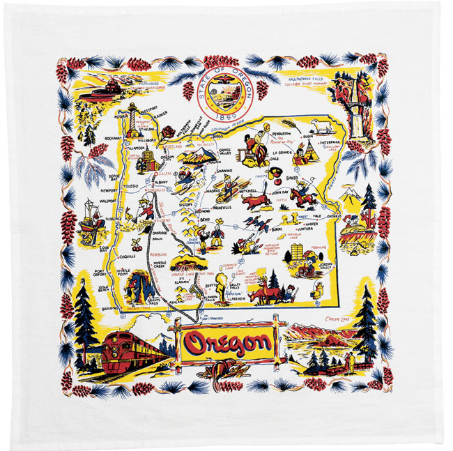 The great state of Oregon, the Beaver State in a fun vintage souvenir map towel. This Geography Map towel of Oregon makes the perfect memento for a memorable trip. 100% Cotton Kitchen Towel measures 22" square.