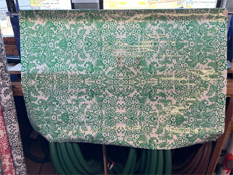 Paradise Lace Green on White Oil Cloth, YardageOilcloth has been around for over a century and when it comes to making a bold color statement anywhere in your home. Oilcloth is a long-lasting, sturdy product that comes in vibrant colors. The oilcloth of yesteryear was resin-coated vinyl and the finish sometimes cracked or flaked. The new version is made of hi-tech plastic that won't crack but has the same colorful shine. Oilcloth has a mesh backing, which means it can really hold a stitch. It can be used for anything that needs to be durable and colorful--tablecloths, upholstered dining room chairs, curtains, bibs, lampshades, tissue boxes, outdoor chairs, etc. Your only limited by your imagination! Oil Cloth measures 48" wide & a full bolt equals 12 continuous yards (36 feet) Don't see the pattern or color you want? Please let us know and we will order it for you!
