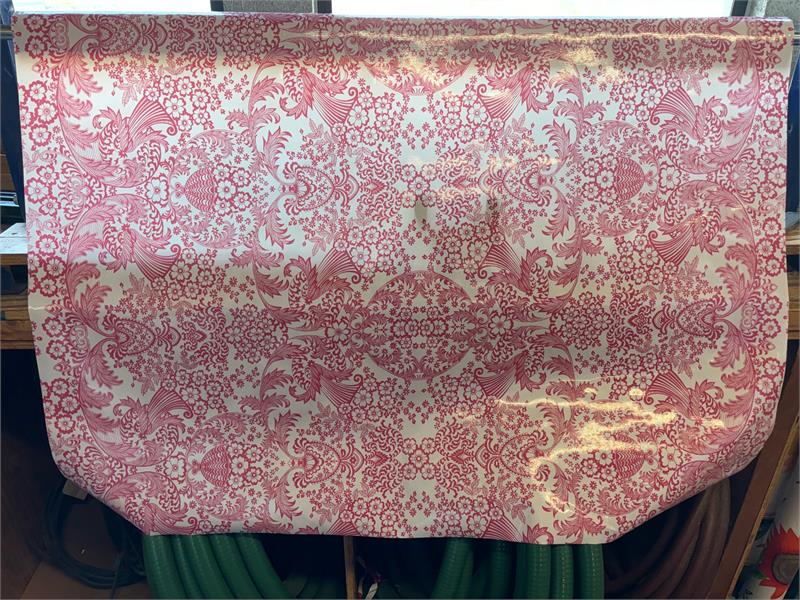 Paradise Lace Pink on White, Full BoltOilcloth has been around for over a century and when it comes to making a bold color statement anywhere in your home. Oilcloth is a long-lasting, sturdy product that comes in vibrant colors. The oilcloth of yesteryear was resin-coated vinyl and the finish sometimes cracked or flaked. The new version is made of hi-tech plastic that won't crack but has the same colorful shine. Oilcloth has a mesh backing, which means it can really hold a stitch. It can be used for anything that needs to be durable and colorful--tablecloths, upholstered dining room chairs, curtains, bibs, lampshades, tissue boxes, outdoor chairs, etc. Your only limited by your imagination! Oil Cloth measures 48" wide & a full bolt equals 12 continuous yards (36 feet) Don't see the pattern or color you want? Please let us know and we will order it for you!Download a sewing pattern with complete instructions that you can print out at home to make an adorable bib with these oil cloth materials courtesy of Oilcloth.com. Click Here