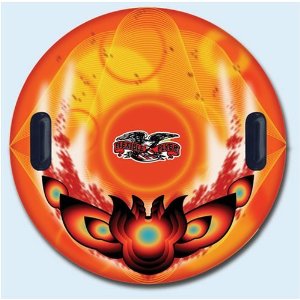 39" inflatable tube. 16-gauge, cold crack vinyl can withstand temperatures to -30 F. 2 rugged handles designed for use with winter gloves. Color: Orange with yellow, red, and black.