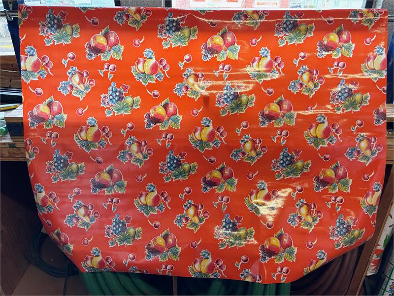 Pears and Apples on Orange Oil Cloth, Full BoltOilcloth has been around for over a century and when it comes to making a bold color statement anywhere in your home. Oilcloth is a long-lasting, sturdy product that comes in vibrant colors. The oilcloth of yesteryear was resin-coated vinyl and the finish sometimes cracked or flaked. The new version is made of hi-tech plastic that won't crack but has the same colorful shine. Oilcloth has a mesh backing, which means it can really hold a stitch. It can be used for anything that needs to be durable and colorful--tablecloths, upholstered dining room chairs, curtains, bibs, lampshades, tissue boxes, outdoor chairs, etc. Your only limited by your imagination! Oil Cloth measures 48" wide & a full bolt equals 12 continuous yards (36 feet) Don't see the pattern or color you want? Please let us know and we will order it for you!Download a sewing pattern with complete instructions that you can print out at home to make an adorable bib with these oil cloth materials courtesy of Oilcloth.com. Click Here
