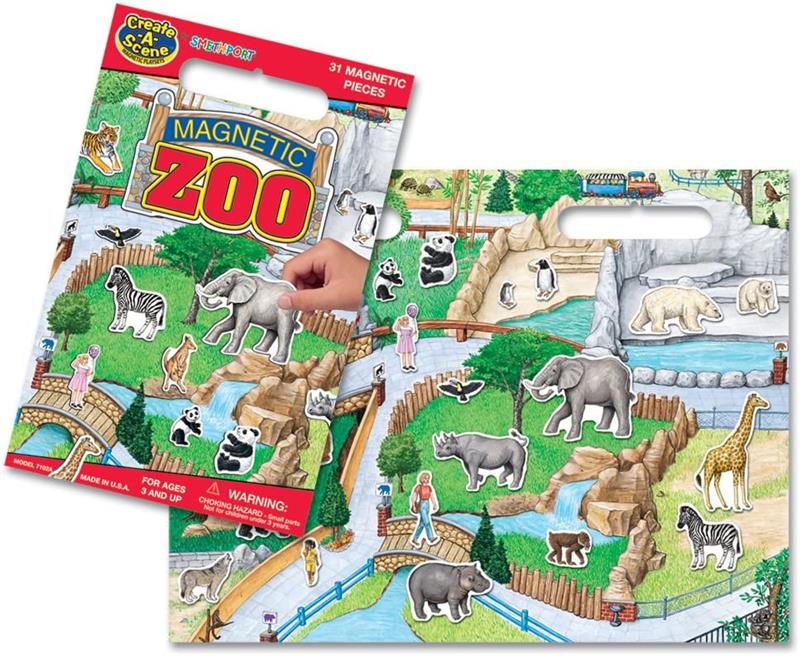 Playmonster Create-A-Scene Magnetic Zoo Playset ToyAre you ready for some new scenery? Has the same old view got you down? Go on your own adventure with Create-A-Scene! Spend hours exploring new places and discovering new things! Use your imagination to craft a fantastical journey or just a simple everyday activity. The choice is yours when you play with Create-A-Scene! Create-A-Scene playsets feature large magnetic play-boards that fold in half for easy storage. And, with a clear, resilient coating, cleanup is a breeze! Kids will love the fun, while parents love the mess-free quiet playtime! Children will exercise their imaginations for hours with this magnetic playset that encourages storytelling, promote problem-solving skills, and build skills in sequencing. The 18" x 14" play board folds in half and is sealed with a clear, resilient coating to make cleanup easier. The vinyl, waterproof magnetic playing pieces provide extra hold. -