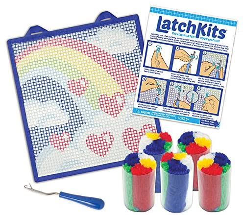 Latch Kits are a fun, easy-to-learn activity—just loop, hook, and pull! Includes everything to make your own mini masterpiece: One latch hook craft tool, five bundles of pre-cut yarn pieces, one color-coded canvas, and one illustrated instruction guide.