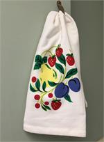 Juicy Cherries are a fun, vintage design in bright red and green colors. 100% Cotton kitchen towel, measures 17" x 24".