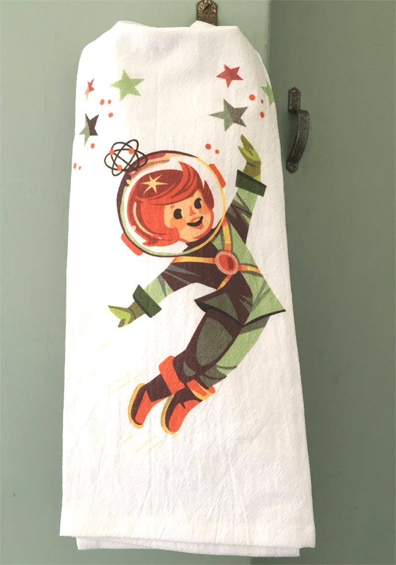 Red and White Kitchen Retro Spaceboy Flour Sack Towel Exuberant little boy in full space gear, heading for the stars to explore....