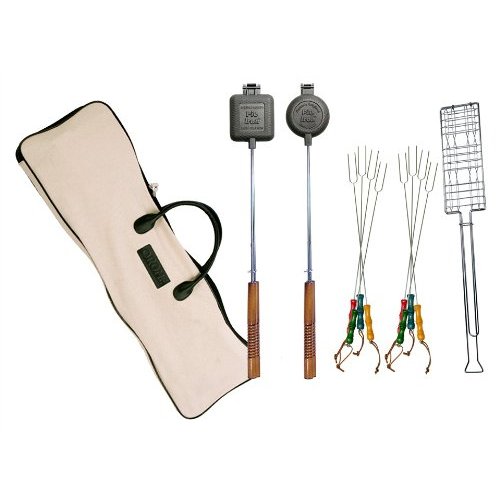 Cooking casual, family oriented treats like Pie Iron sandwiches & s'mores is a great way to enjoy the backyard firepit. This set of Rome's best selling cookware includes 1 square cast iron Pie Iron, 1 round cast iron Pie Iron, 1 S'more Maker & 8 Picnic Forks. Also includes a 30" x 10" canvas storage bag for your pie irons and forks.