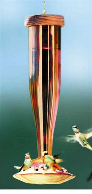 Our hummingbird lanterns feature a hand-lathed redwood base complete with brass accent ring containing three ruby anodized flowers. The bottle is beautiful art quality glass. This design is leak free and easy to clean and refill. 12" Tall, holds one pint. This item proudly made in the U.S.A.