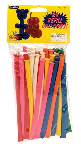 24 assorted colored balloons to be used with the Schylling Retro Balloon Animal Making Kit. Measures 9.75 x 4.12 x .75 in package. Suitable for children ages 8 and over.