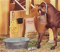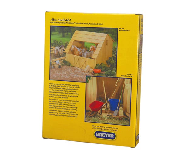 Finely-detailed boxed set includes aluminum water trough, hay bale and hay net, feed bucket, feedbag, bag of feed and feed scoop. Traditional Size Horse and barn not included.