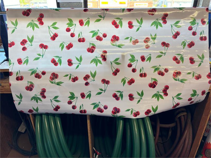Stella Cherries on White Oil Cloth, Full BoltOilcloth has been around for over a century and when it comes to making a bold color statement anywhere in your home. Oilcloth is a long-lasting, sturdy product that comes in vibrant colors. The oilcloth of yesteryear was resin-coated vinyl and the finish sometimes cracked or flaked. The new version is made of hi-tech plastic that won't crack but has the same colorful shine. Oilcloth has a mesh backing, which means it can really hold a stitch. It can be used for anything that needs to be durable and colorful--tablecloths, upholstered dining room chairs, curtains, bibs, lampshades, tissue boxes, outdoor chairs, etc. Your only limited by your imagination! Oil Cloth measures 48" wide & a full bolt equals 12 continuous yards (36 feet) Don't see the pattern or color you want? Please let us know and we will order it for you!Download a sewing pattern with complete instructions that you can print out at home to make an adorable bib with these oil cloth materials courtesy of Oilcloth.com. Click Here