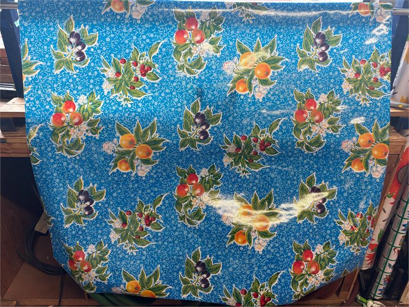 Summer Fruit on Blue Oil Cloth, Full BoltOilcloth has been around for over a century and when it comes to making a bold color statement anywhere in your home. Oilcloth is a long-lasting, sturdy product that comes in vibrant colors. The oilcloth of yesteryear was resin-coated vinyl and the finish sometimes cracked or flaked. The new version is made of hi-tech plastic that won't crack but has the same colorful shine. Oilcloth has a mesh backing, which means it can really hold a stitch. It can be used for anything that needs to be durable and colorful--tablecloths, upholstered dining room chairs, curtains, bibs, lampshades, tissue boxes, outdoor chairs, etc. Your only limited by your imagination! Oil Cloth measures 48" wide & a full bolt equals 12 continuous yards (36 feet) Don't see the pattern or color you want? Please let us know and we will order it for you!