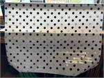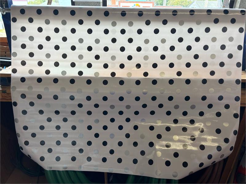 Tokyo Dots Black and Silver on White Oil Cloth, Full BoltOilcloth has been around for over a century and when it comes to making a bold color statement anywhere in your home. Oilcloth is a long-lasting, sturdy product that comes in vibrant colors. The oilcloth of yesteryear was resin-coated vinyl and the finish sometimes cracked or flaked. The new version is made of hi-tech plastic that won't crack but has the same colorful shine. Oilcloth has a mesh backing, which means it can really hold a stitch. It can be used for anything that needs to be durable and colorful--tablecloths, upholstered dining room chairs, curtains, bibs, lampshades, tissue boxes, outdoor chairs, etc. Your only limited by your imagination! Oil Cloth measures 48" wide & a full bolt equals 12 continuous yards (36 feet) Don't see the pattern or color you want? Please let us know and we will order it for you!