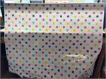 Tokyo Dots Blue and Yellow on White Oil Cloth, Full Bolt of 12 Yards. Oilcloth yardage in a fun and effervescent polka-dot pattern. Multi-color dots about 1" across are scattered on a white background.