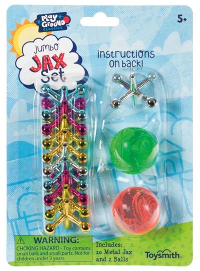 A classic jacks set, the Metal Jax Set from Playground Classics includes 10 metal jacks and 1 two-toned, brightly colored hi-bounce ball. Works great with the jacks or as a stand-alone bouncy toy. Lightweight and traditionally designed, each 1-inch jack is made of quality, lightweight metal that is silver in color. Suitable for indoor or outdoor play on any flat surface, all game pieces come in an outdoor-themed peggable blister packet with instructions on the back. Ages 5 and up.
