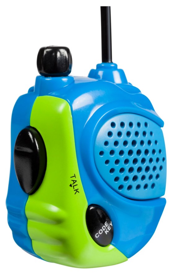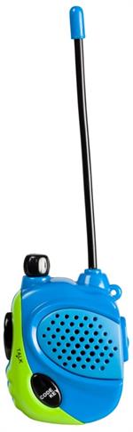 This set of 2 mini walkie-talkies from Outdoor Discovery is a miniature fun-sized version of the Outdoor Discovery Walkie Talkies. The Mini Walkie Talkies include 2 battery-powered compact walkie-talkies, each with 2 transistors, a flexible antenna, and a press-to-talk function and volume control. Packaged in a peggable plastic packet. Each walkie-talkie stands 2.5 inches tall, is brightly colored in blue, green, and black, and can communicate up to 200 feet.