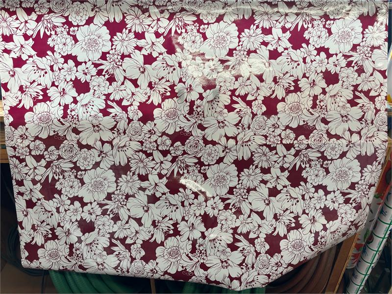 Victoria on Burgundy Oil Cloth, YardageOilcloth has been around for over a century and when it comes to making a bold color statement anywhere in your home. Oilcloth is a long-lasting, sturdy product that comes in vibrant colors. The oilcloth of yesteryear was resin-coated vinyl and the finish sometimes cracked or flaked. The new version is made of hi-tech plastic that won't crack but has the same colorful shine. Oilcloth has a mesh backing, which means it can really hold a stitch. It can be used for anything that needs to be durable and colorful--tablecloths, upholstered dining room chairs, curtains, bibs, lampshades, tissue boxes, outdoor chairs, etc. Your only limited by your imagination! Oil Cloth measures 48" wide & a full bolt equals 12 continuous yards (36 feet) Don't see the pattern or color you want? Please let us know and we will order it for you!