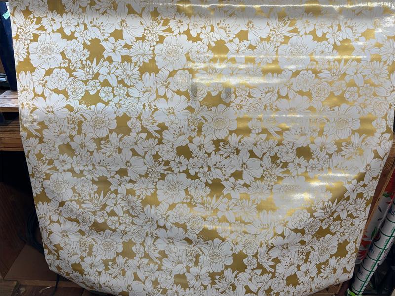 Victoria on Gold Oil Cloth, Full BoltOilcloth has been around for over a century and when it comes to making a bold color statement anywhere in your home. Oilcloth is a long-lasting, sturdy product that comes in vibrant colors. The oilcloth of yesteryear was resin-coated vinyl and the finish sometimes cracked or flaked. The new version is made of hi-tech plastic that won't crack but has the same colorful shine. Oilcloth has a mesh backing, which means it can really hold a stitch. It can be used for anything that needs to be durable and colorful--tablecloths, upholstered dining room chairs, curtains, bibs, lampshades, tissue boxes, outdoor chairs, etc. Your only limited by your imagination! Oil Cloth measures 48" wide & a full bolt equals 12 continuous yards (36 feet) Don't see the pattern or color you want? Please let us know and we will order it for you!