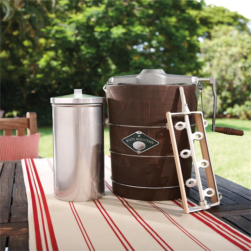 Made in classic American style, this ice cream bucket is handcrafted of sturdy New England white pine by the 150 year old White Mountain Company. This ice cream maker turns out ultrasmooth old-fashioned ice cream or frozen yogurt in 20 to 40 minutes. Triple motion action dasher system, heavy-duty hand crank, stainless steel canister and lid. Bucket is bound by strong galvanized hoops for durability. Recipes included.